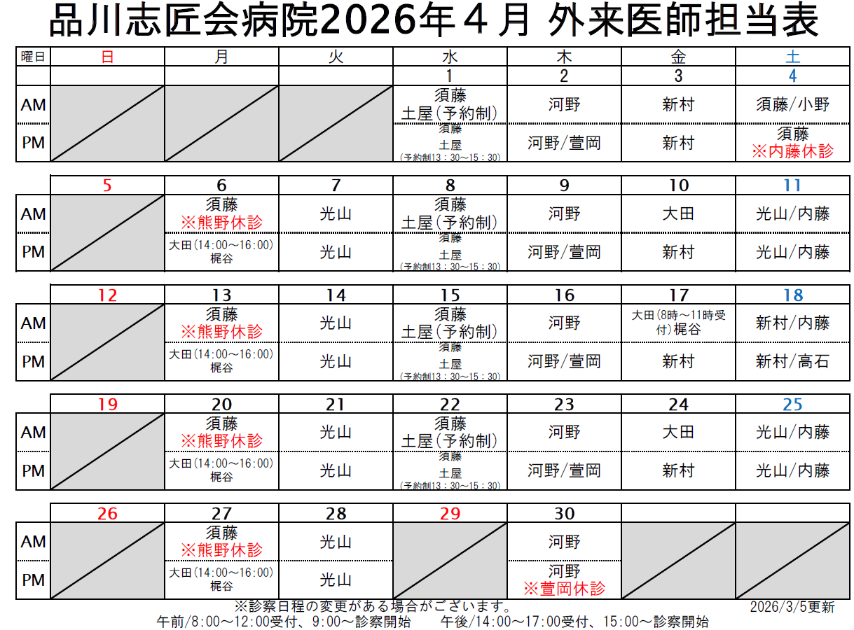 2026年4月 外来医師担当表